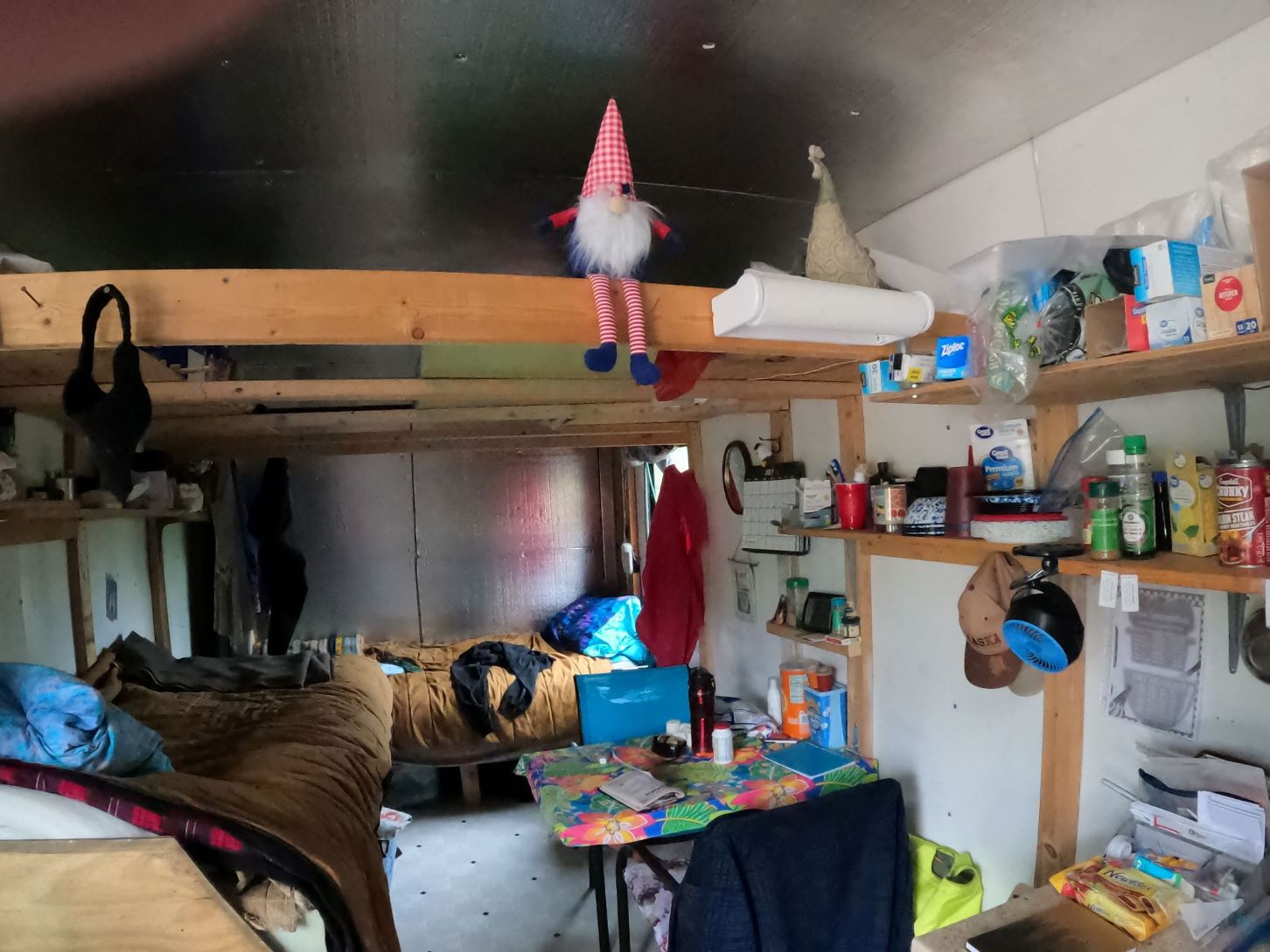 It's basicly a cargo trailer that I have upgraded with 2 beds, a table, cabinets, and a propane stove